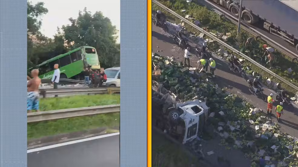 Um acidente envolvendo um ônibus e uma carreta carregada de bananas provocou a interdição da BR-116, na altura de Magé, na Baixada Fluminense, na manhã desta sexta-feira
