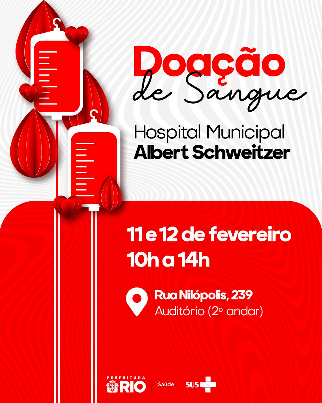 A Secretaria Municipal de Saúde do Rio de Janeiro realiza, nos dias 11 e 12 de fevereiro, uma campanha especial de doação de sangue no Hospital Municipal Albert Schweitzer, em Realengo, na Zona Oeste da cidade. A iniciativa ocorre das 10h às 14h, no auditório da unidade, e tem como objetivo reforçar os estoques sanguíneos diante do aumento da demanda no período de Carnaval.