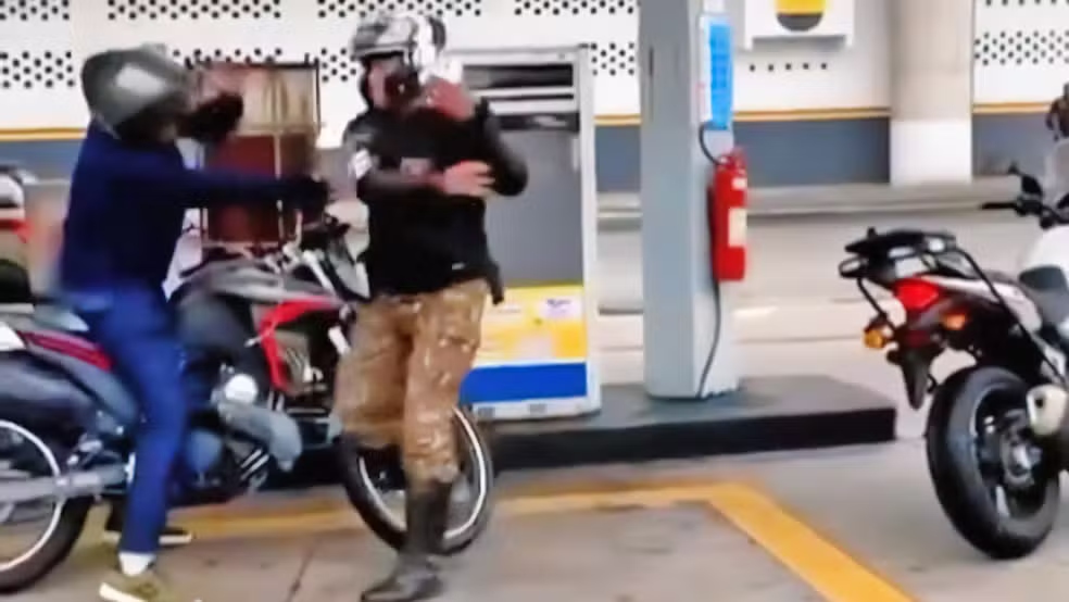 Segundo as imagens que repercutiram online, o militar chegou a dar um tapa no rosto do motociclista durante a abordagem, que ocorria no pátio do posto. Em seguida, a moto da vítima caiu no chão enquanto testemunhas registravam a cena e um colega do militar tentava separar os envolvidos.